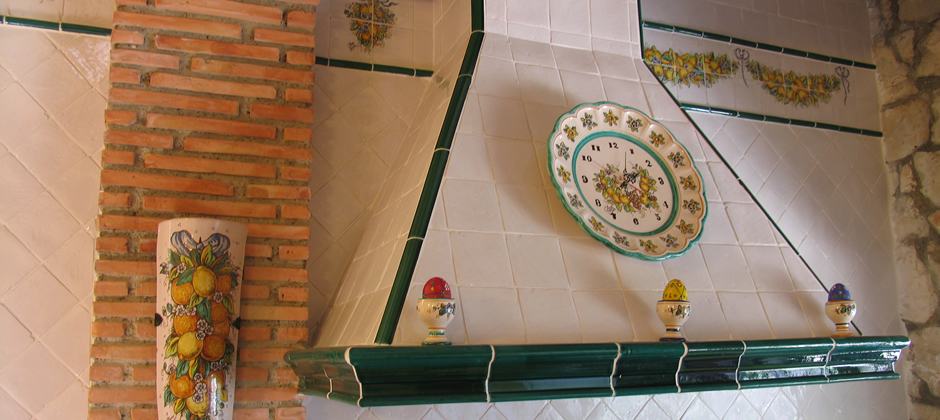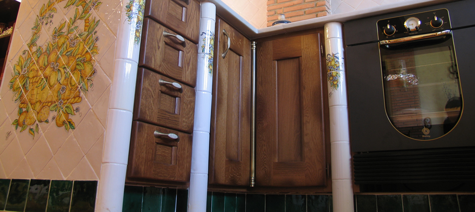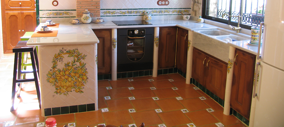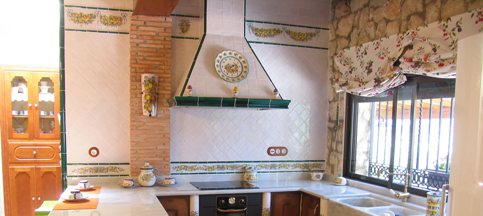 Cocina alicatada con azulejos de cerámica de 10 x 10 cm blanco antiguo, el pilar que se encuentra al lado de la campana, se alicató con caravista de barro manual cocido, donde se colocó una teja hecha a mano y decorada con naranjas y limones como la cenefa. La campana se realizó con la moldura barsella en verde claur, alicatada con azulejos de 10 x 10 y las aristas rematadas con media caña de 3 x 20 en verde claur, la cenefa alta de la cocina se pintó con guirnaldas de naranjas y limones, está cenefa se pintó a medida para cada sitio. El remate de que el final de la barra se alicató con una cesta pintada a mano con naranjas y limones. Las puertas de esta cocina están separadas por tabiques de obra, los cuales se remataron con media caña pasamano pintadas con lazos de naranjas y limones.Todas las piezas de complemento de esta cocina se realizaron a juego con las cenefas y colores de la misma, como se aprecia en el reloj de la campana, el salero y otros. El pavimento de esta cocina está realizado con azulejos de 30 x 30 en barro manual, que incorpora también azulejos de 8 x 8 cm decorados con frutas. Ver Cocina »