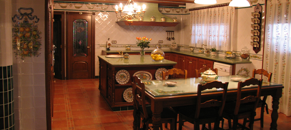 Cocina alicatada con azulejos de cerámica de 10 x 10 cm, blanco antiguo, con cenefa encima del banco de naranjas y limones pintada a mano y a medida. en la parte alta cenefa de guirnaldas de frutas a medida, rematadas con moldura verde Claur y lístelo de 1 cm. En la entrada parte derecha, pilar alicatado con azulejo de 15 x 7,5 cm en verde Claur y el resto en blanco roto, junto al pilar lazo con guirnalda de naranjas y limones acompañada de hojas de naranjo y flores de azahar, todo pintado a mano y a medida. En el centro de la cocina office con repisas para bandejas o vajilla, las bandejas se pintaron a juego con los colores de la cocina. En el mismo office se coloco una pila de cocina de cerámica a juego y también pintada a mano. Las puertas de esta cocina en la parte superior central ovalo de cerámica con detalle decorativo a juego, entre las puertas en un mueble especial se colocó juego de café pintado a mano y a juego con los colores. Todas las piezas de complemento de esta cocina se realizaron a juego con las cenefas y colores de la misma, como se aprecia en la campana y sobre el banco, la lámpara también se realizó en mi taller con una combinación de hierro y cerámica. Ver Cocina »